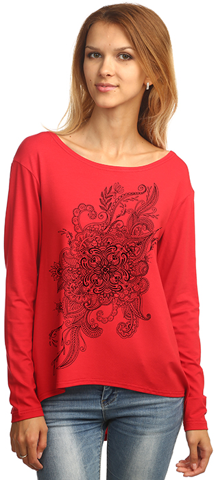 Дополнительная информация: Блуза расклешенного силуэта с вырезом горловины "лодочка" и удлиненной спинкой. Свободная, удобная и эффектная модель выполнена из приятного на ощупь тонкого трикотажа.